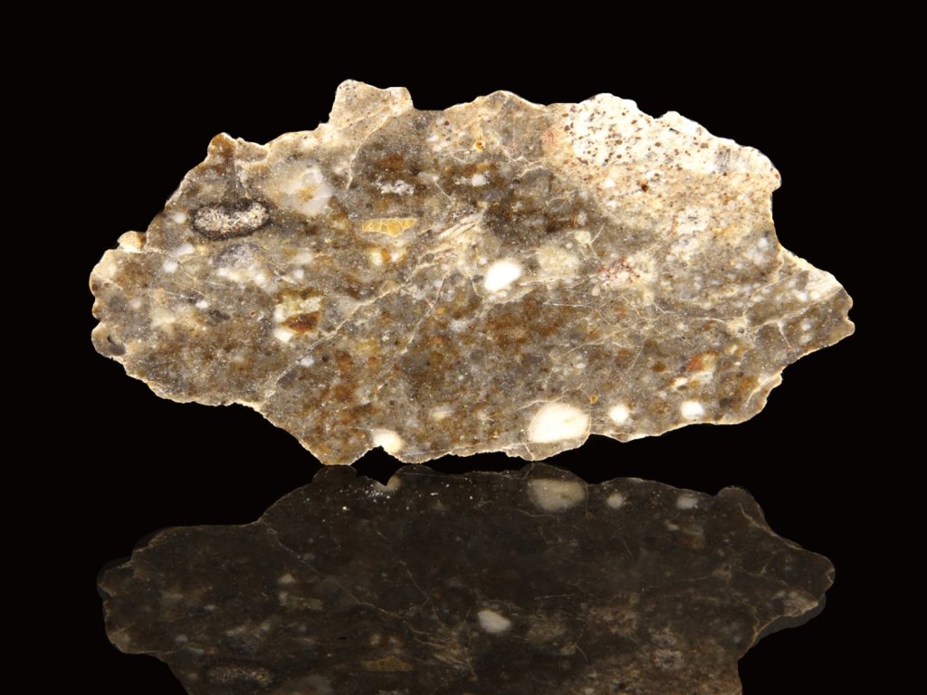 Meteorite NWA 11182 is a fascinating lunar meteorite classified as a feldspar breccia. Its internal structure contains white feldspar clasts embedded in a dark grey matrix with areas of melt resulting from strong impact shock. Unlike many lunar breccias, which are usually monochromatic, NWA 11182 contains shades of brown, red and dark maroon, making it particularly colourful and unique.
