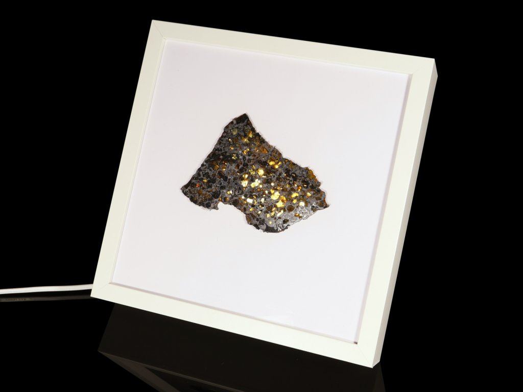 The meteorite is placed in a backlit frame that can be placed on a table or wall. Power supply via cable to socket.