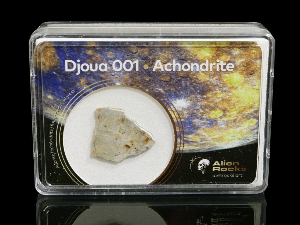 Tento netypický meteorit se jménem Djoua 001 je neobvyklý achondrit, klasifikovaný jako aubrit. Původ aubritů je stále zahalen tajemství a je velmi pravděpodobné, že se jedná o kus planety Merkur. Více nám snad potvrdí jedna ze 2 sond, které jsou na cestě k planetě Merkur, na palubě rakety Ariane 5, a které na místo dorazí v prosinci roku 2025.