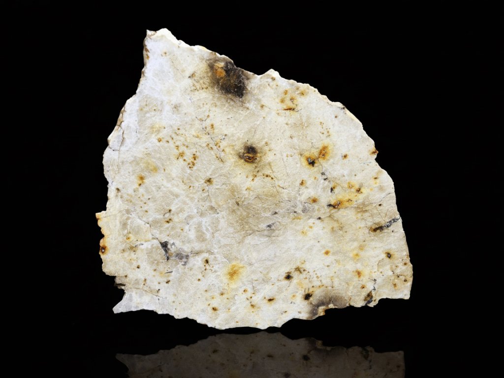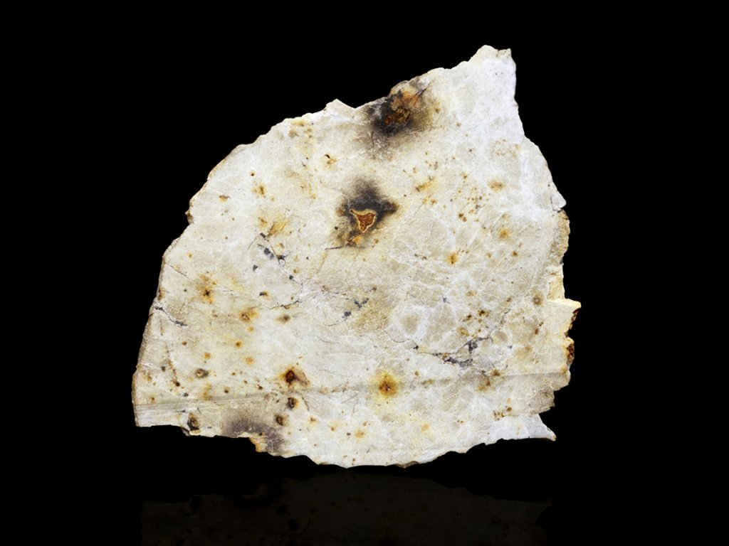 Tento plátek netypického meteoritu se jménem Djoua 001 je neobvyklý achondrit, klasifikovaný jako aubrit. Původ aubritů je stále zahalen tajemství a je velmi pravděpodobné, že se jedná o kus planety Merkur. Více nám snad potvrdí jedna ze 2 sond, které jsou na cestě k planetě Merkur, na palubě rakety Ariane 5, a které na místo dorazí v prosinci roku 2025.