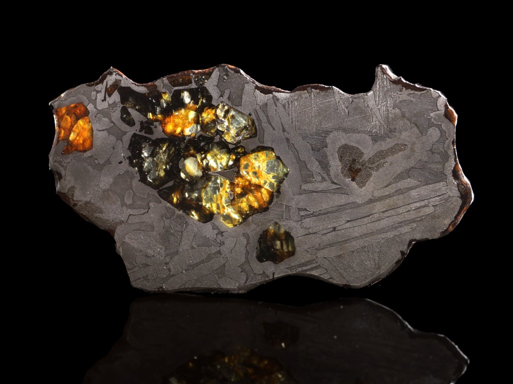 Tento plátek meteoritu Seymchan představuje jednu z nejestetičtějších forem meteoritické hmoty – pallasit.